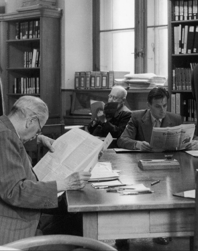 Abb. 6: Drei Männer bei der Lektüre im Lesesaal des Schweizerischen Sozialarchivs, 1956. Foto W.E. Baur, Zürich; Archiv des Schweizerischen Sozialarchivs, F 5009-Fx-015.