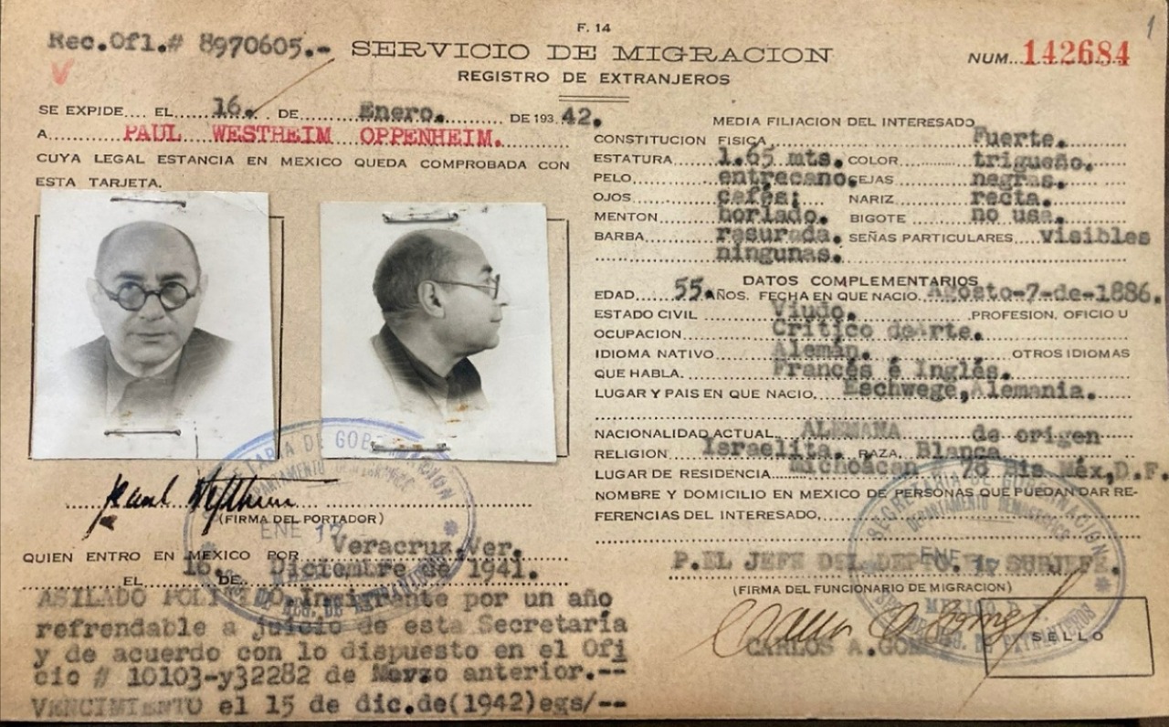 Paul Westheim wurde wie viele andere deutsch-jüdische Geflüchtete als ,feindlicher Ausländer‘ in verschiedenen Lagern in Frankreich inhaftiert, ehe er zwei Jahre später über Marseille via Lissabon nach Mexiko fliehen konnte. Sein Visum bekam er von Gilberto Bosques (1892–1995). Bosques war seit 1939 mexikanischer Generalkonsul in Paris und von 1940 bis 1942 in Marseille, wo er tausenden Menschen auf der Flucht Visa für Mexiko ausstellte. Mexiko entwickelte sich zum wichtigsten Exilland für verfolgte Mitglieder der Kommunistischen Partei, während man jüdischen Geflüchteten restriktiver begegnete, die dort aufgrund ,rassischer‘ Verfolgung Zuflucht suchten. Die Zahl deutscher Jüdinnen und Juden blieb in Mexiko – im Vergleich zu anderen lateinamerikanischen Ländern – daher gering.