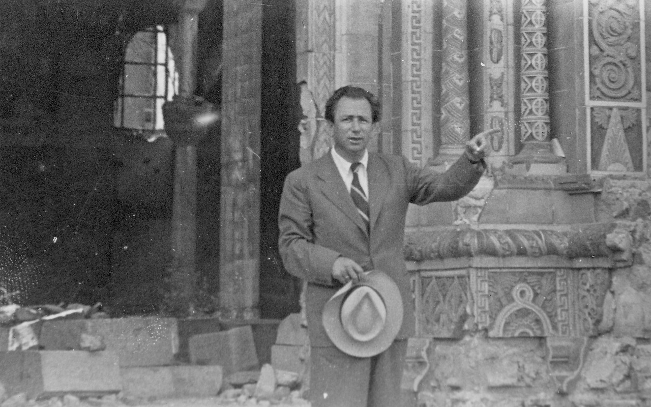 Abb. 3: Joachim Prinz vor seiner zerstörten Synagoge „Friedenstempel“, 1949. Unbekannter Fotograf / American Jewish Archives.