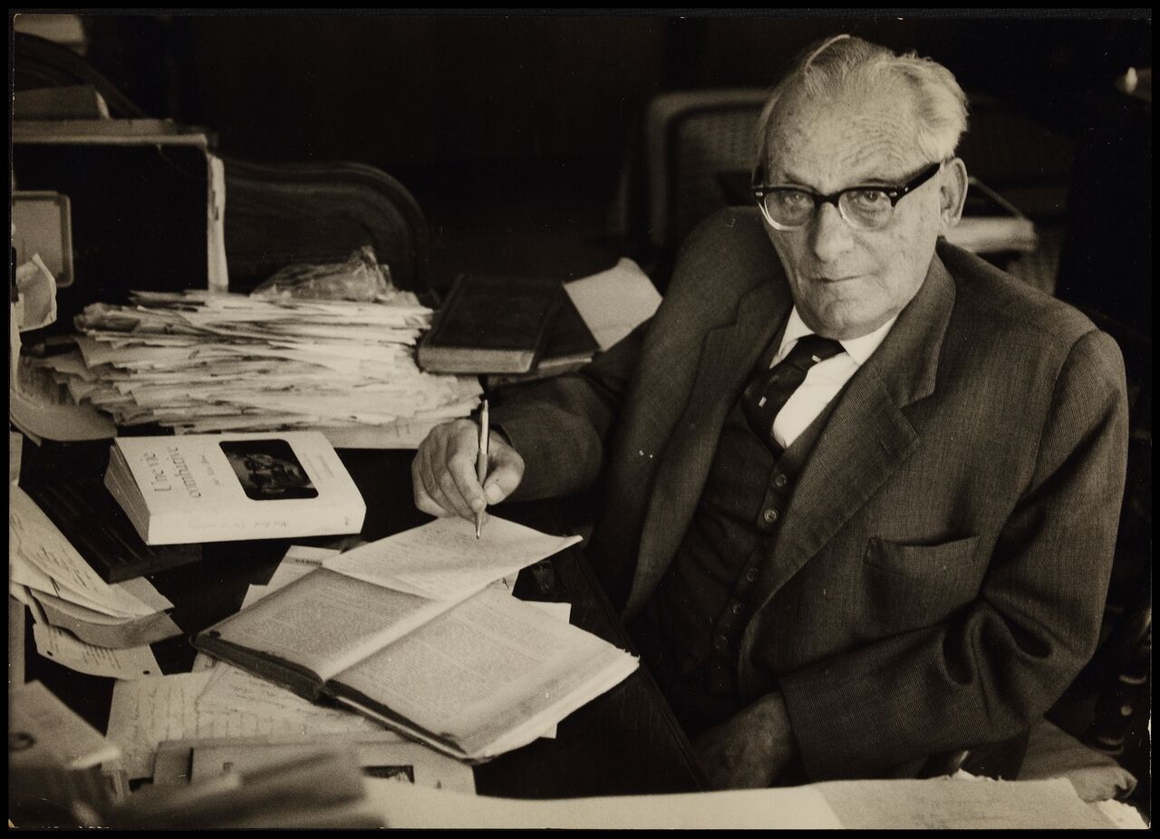 Abb. 1: Porträt von Max Brod am Schreibtisch in seiner Wohnung in Tel Aviv, 1964. Aufgenommen von Hans H. Pinn (1916–1978), einem in Berlin geborenen israelischen Fotografen; Max-Brod-Archiv, ARC. 4* 2000 08 076, National Library of Israel.