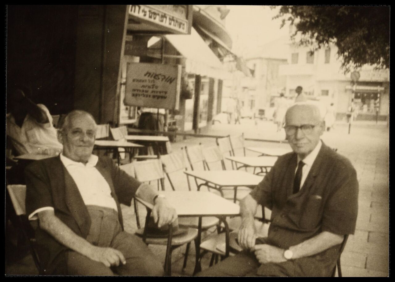 Abb. 4: Max Brod und Felix Weltsch vor einem Café in Israel, um 1964. Das Foto wurde von Ilse Ester Hoffe (1906–2007), Brods Sekretärin und Lebensgefährtin, aufgenommen; Max-Brod-Archiv, ARC. 4* 2000 08 083, National Library of Israel.