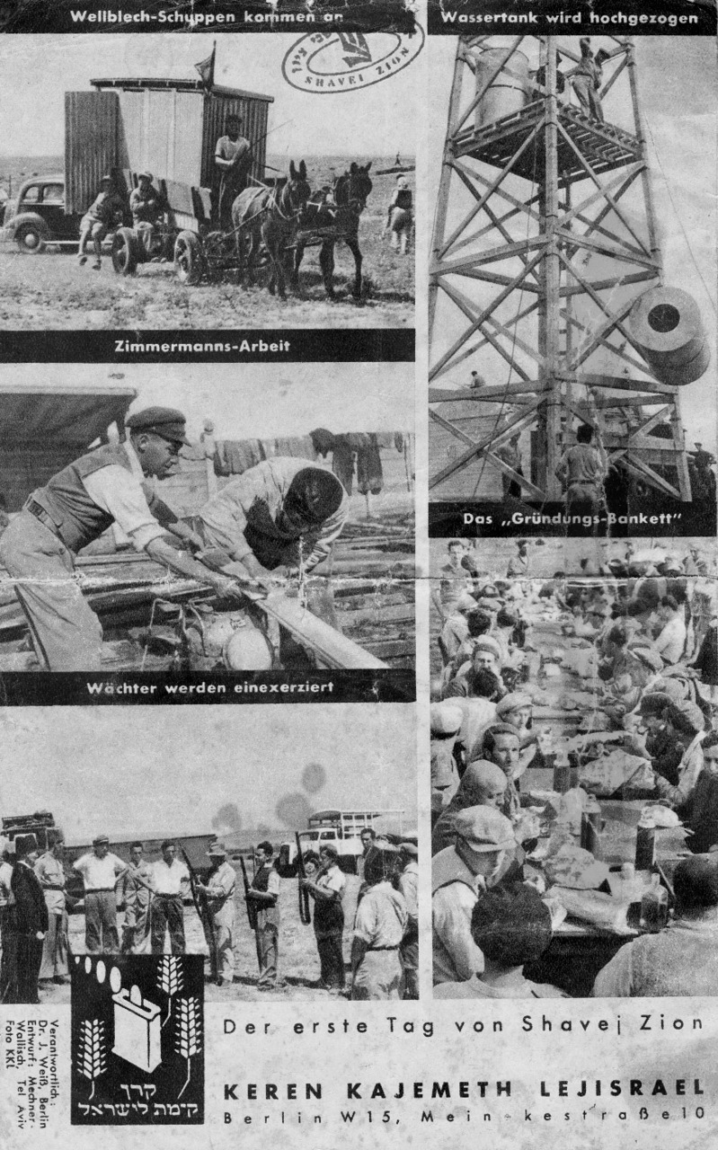Abb. 2: „Der erste Tag von Shavej Zion“. Werbeblatt des JNF, das den Aufbau von Shavei Zion zeigt. Zu sehen sind unter anderem Männer aus der Siedlung, die als sogenannte Wächter „einexerziert“ wurden, April 1938; Archiv von Shavei Zion.