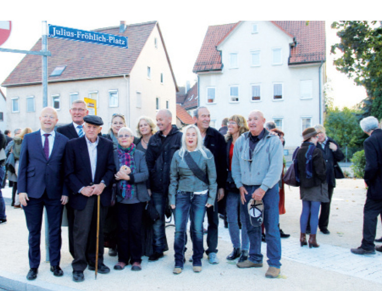 Abb. 4: Amos Fröhlich (dritter von links) mit seiner Familie und Vertretern der Stadt Tuttlingen bei der Umbenennungszeremonie des ,Julius-Fröhlich-Platzes‘, 2015; Barbara Staudacher Verlag.